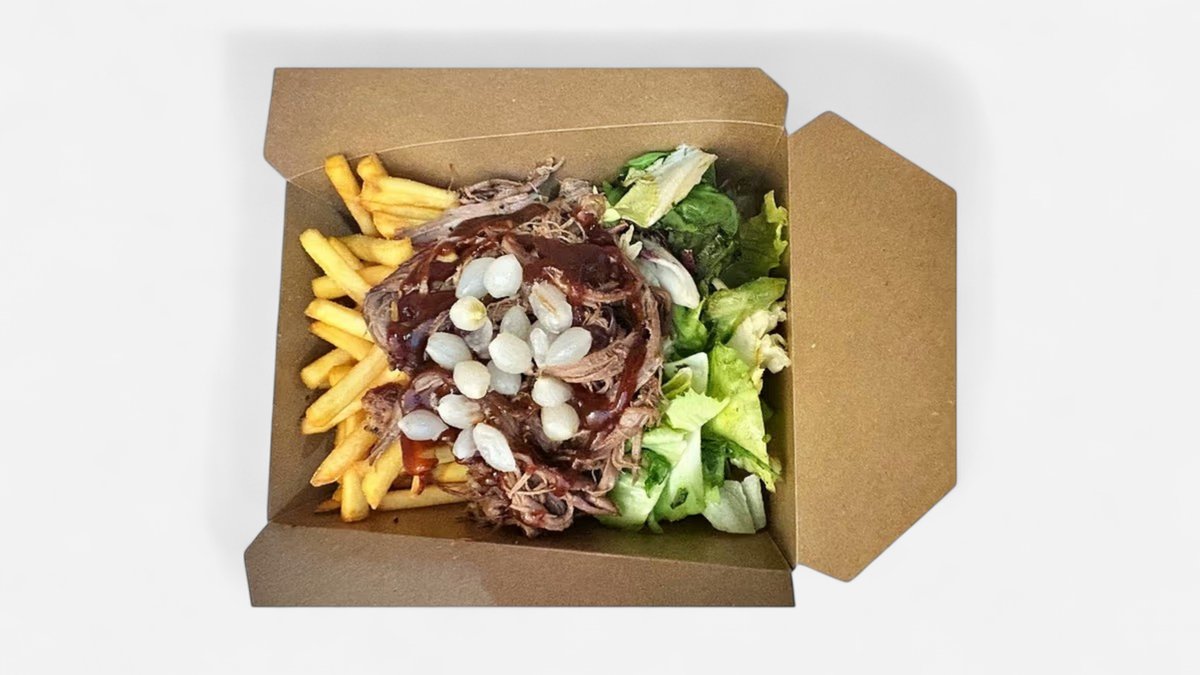 450g obsahuje:1,2,3,7,8,9,10,11 Box s hovadzim mäsom, hranolkami a zeleninou podľa texaského receptu 13 hodín grilované trhane maso