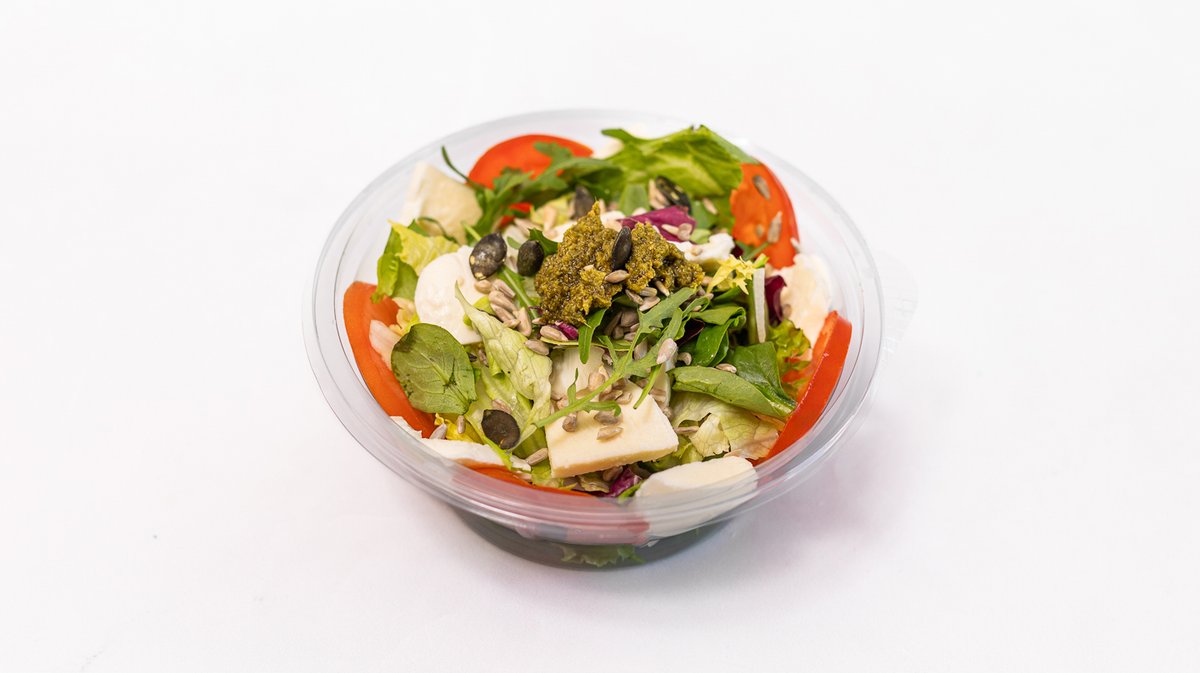 zelené pesto, mozzarella, rajčiny, rukola, balzamico, ručne triedený praný šalát mix, extra panenský olivový olej 290g / obsahuje: 1,3,6,7,8,11