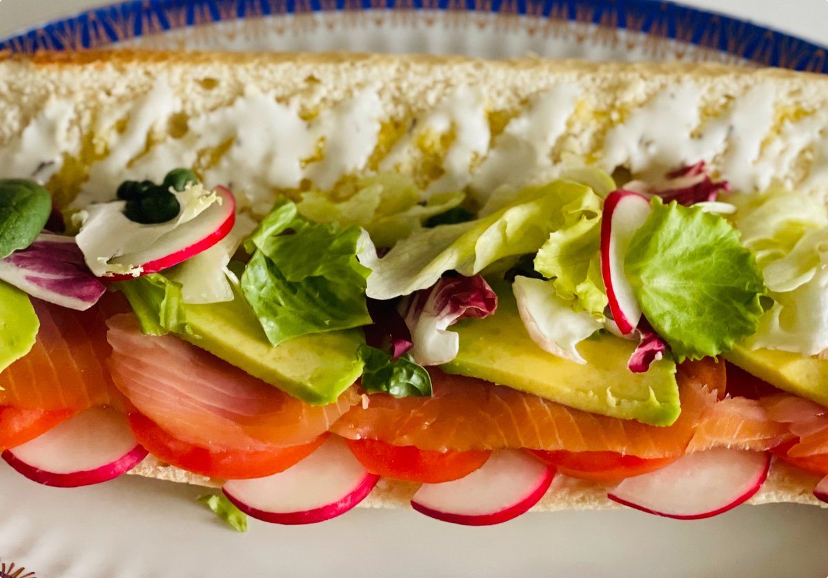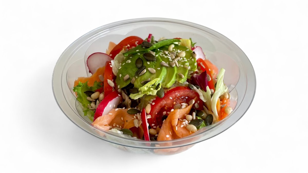 Gazdovské maslo, rajčiny, reďkovka, pravý údený nórsky losos, avokádo, ručne triedený praný šalát mix, extra panenský olivový olej 290g / obsahuje: 1,3,4,6,7,8,11