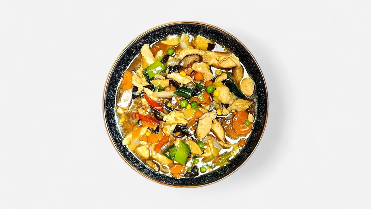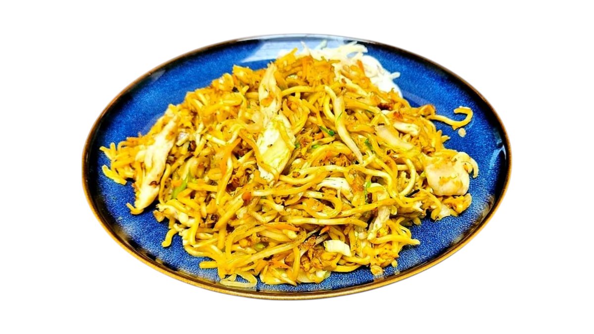 na wok panvici opekané pšeničné rezance s : vajce ,čínska kapusta, mrkva, pór,kuracie mäso 400g / obsahuje: 1,3