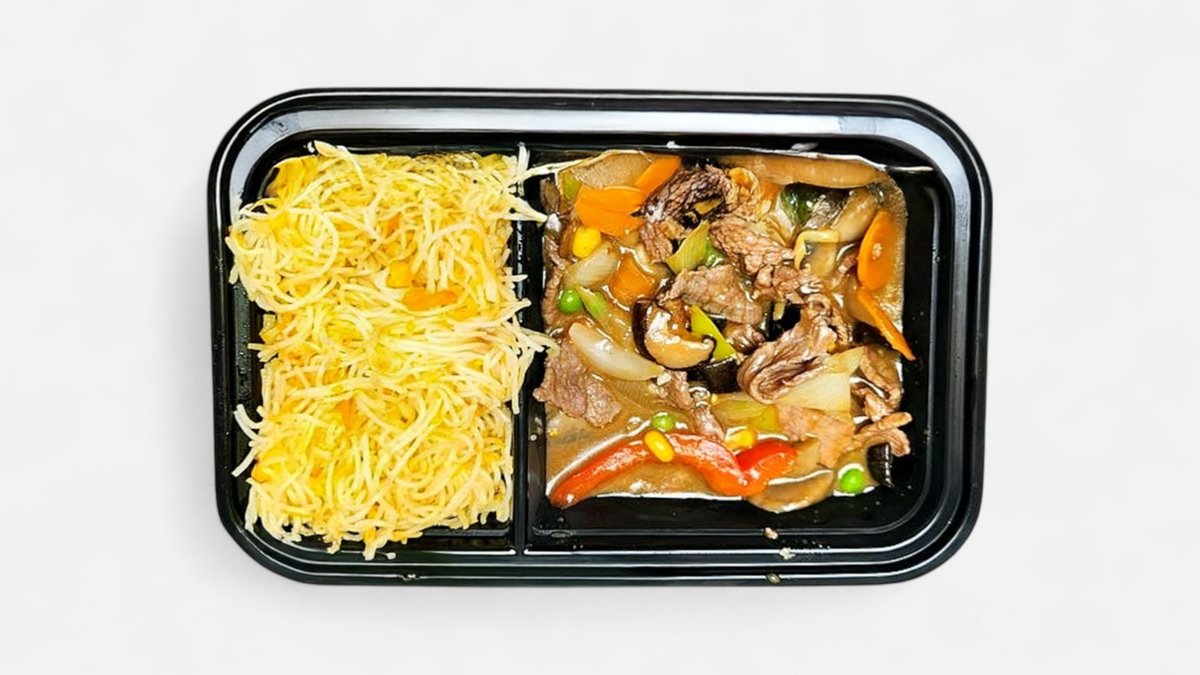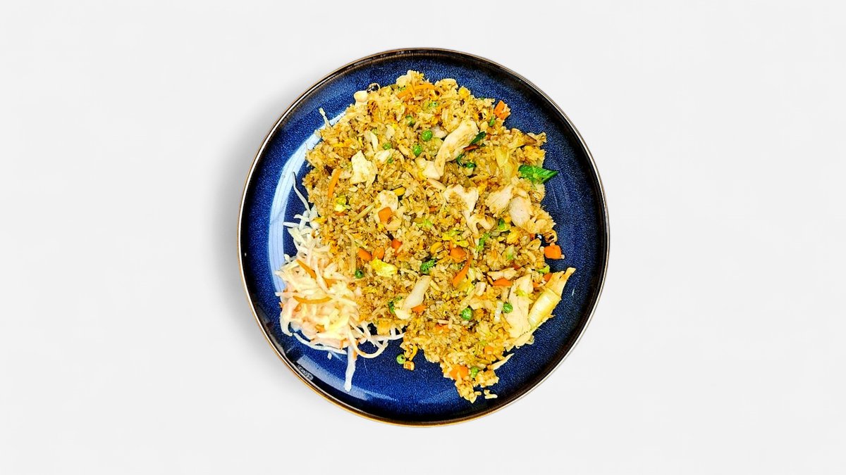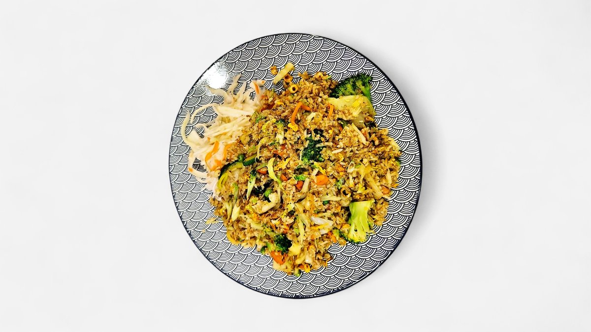 na wok panvici opekaná jasminová ryža s : vajce ,čínska kapusta, mrkva, pór,hrašok, kukurica, tofu, 400g / obsahuje: 3,6