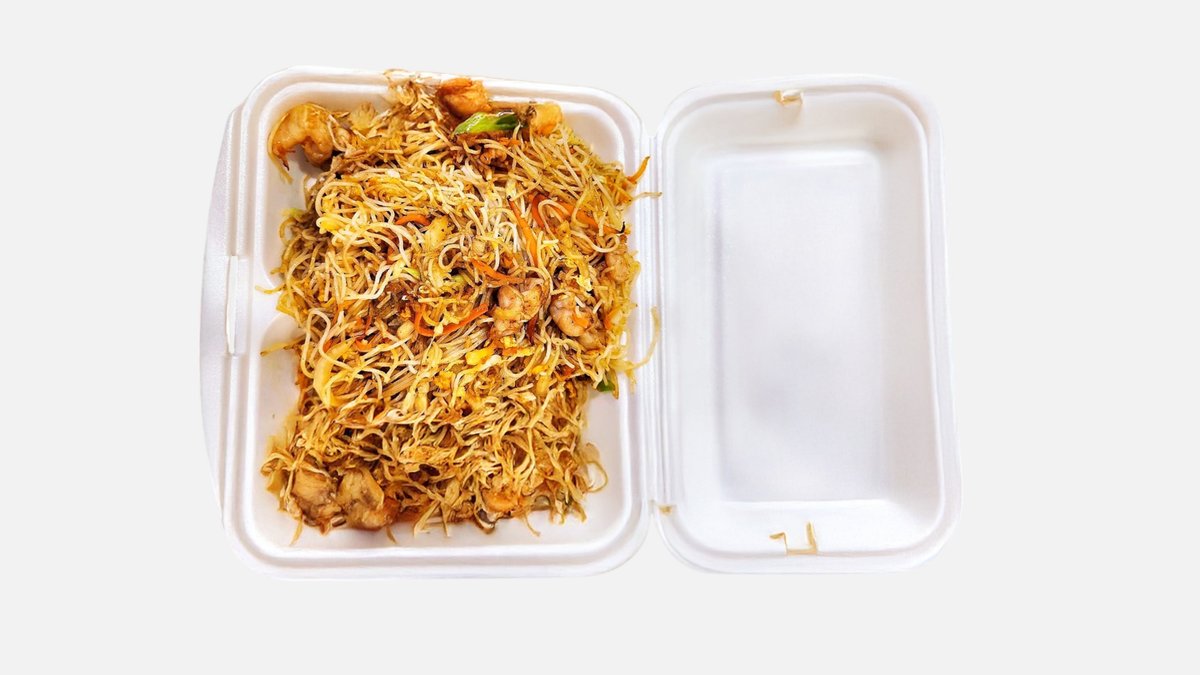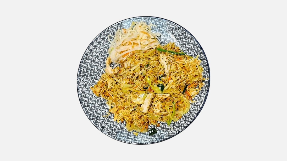 na wok panvici opekané ryžové rezance s : vajce čínska kapusta, mrkva, pór, kuracie mäso, 400g / obsahuje: 3