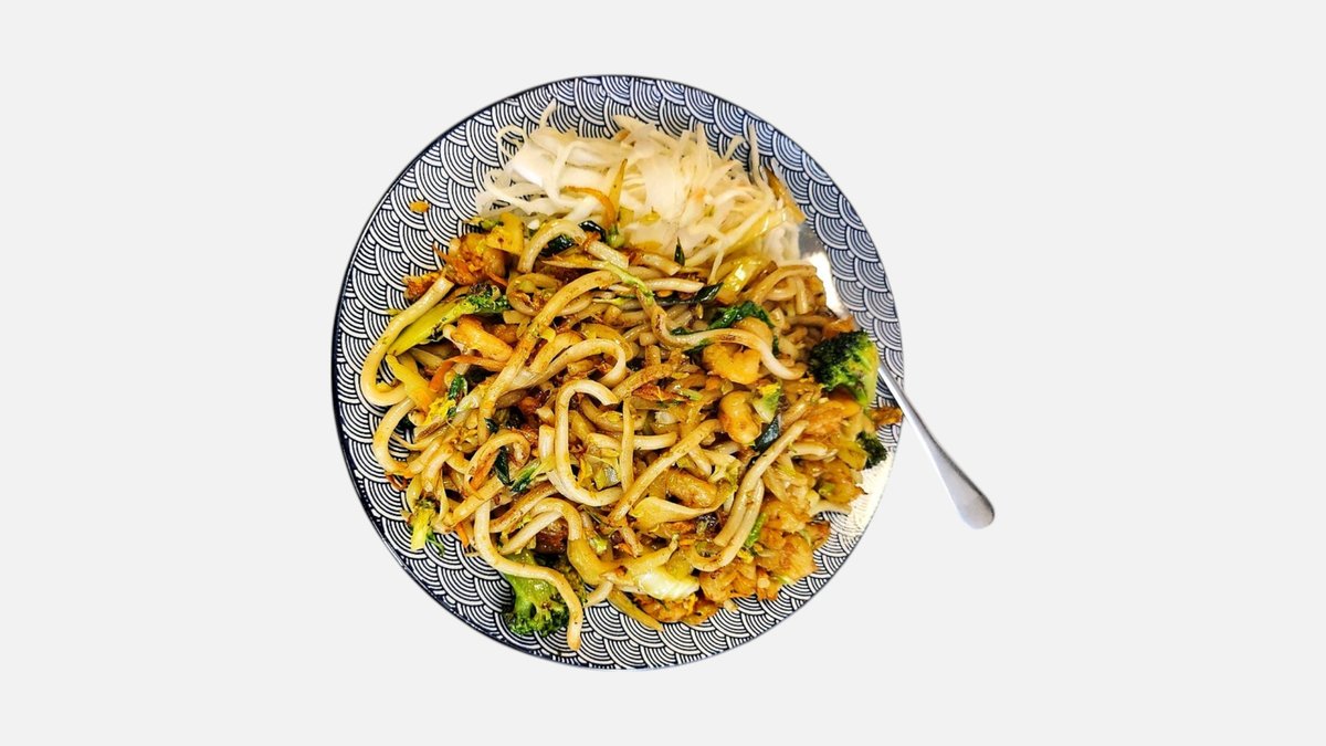 na wok panvici opekané udon rezance s : vajce ,čínska kapusta, mrkva, pór, kuracie mäso, 400g / obsahuje: 1,3