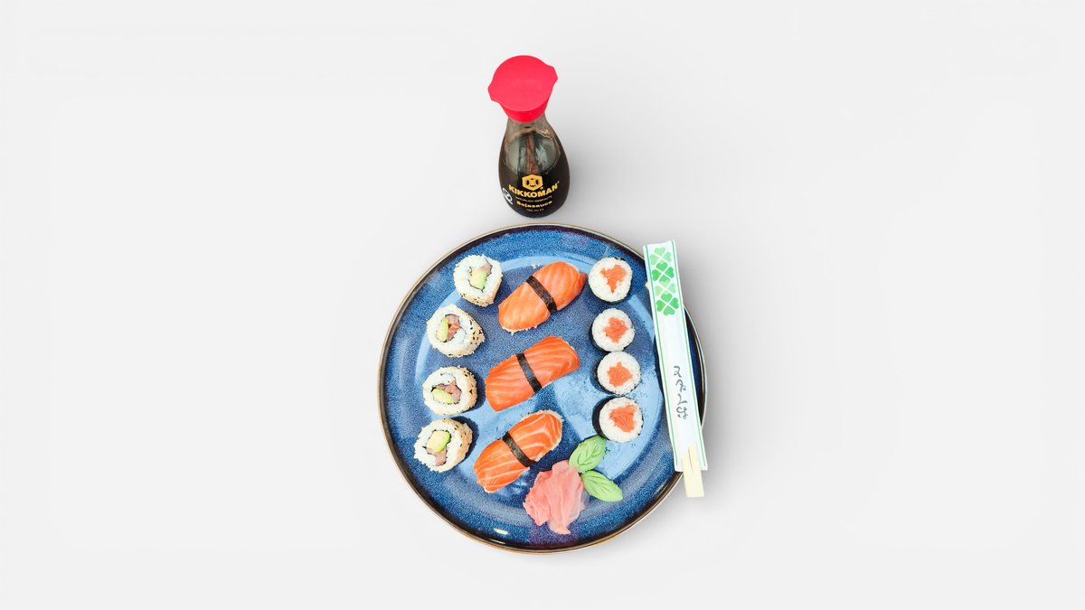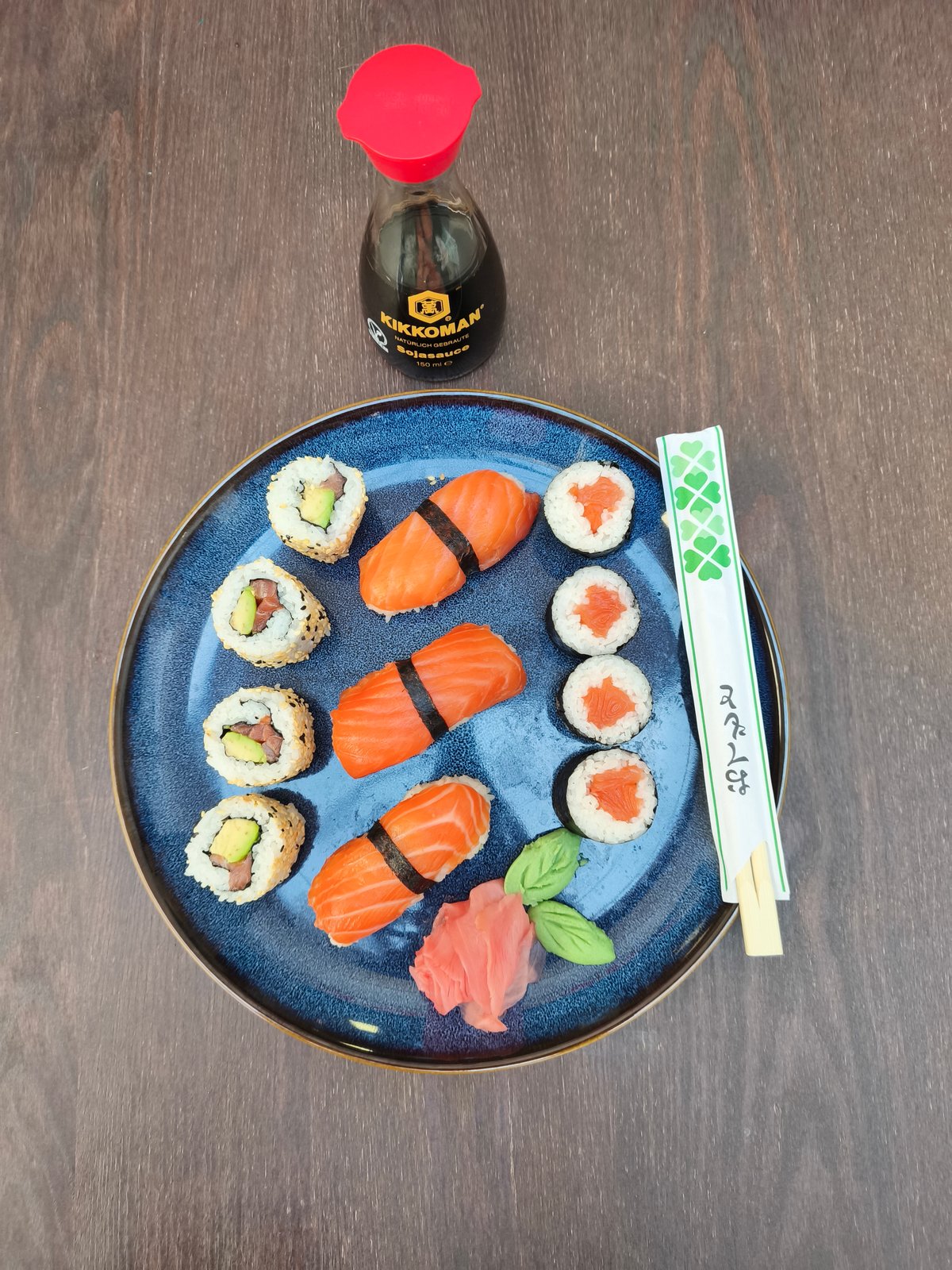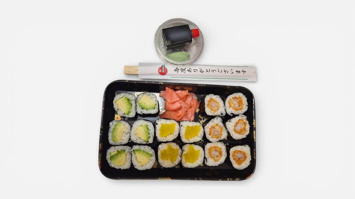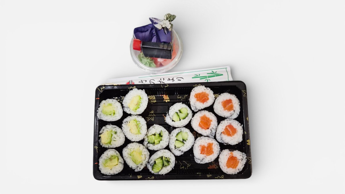 6 maki losos+ 6 avokádo maki+ 2 maki uhorka+ 2maki nákladaná redkva/ mango
