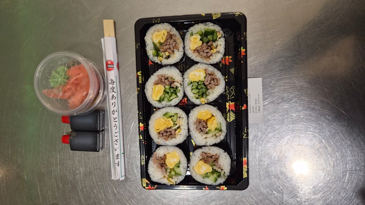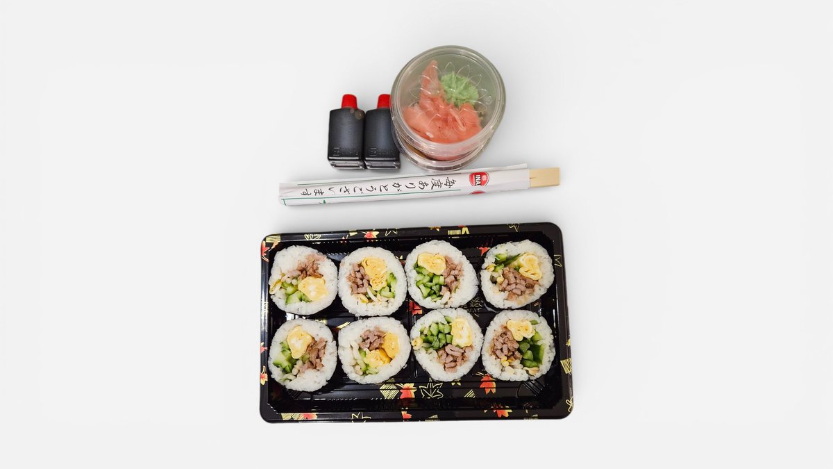 roll s hovädzie teriyaki , ryža, sezamová omáčka, vajíčko, uhorka, žltá nákladaná reďkovka