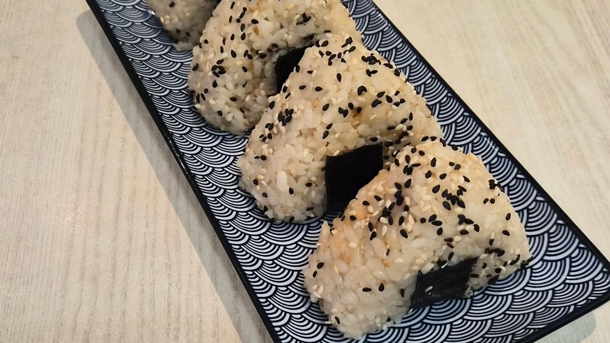 4 ks onigiri, sushi ryža, sezamová omáčka, losos opekaný, majonéza