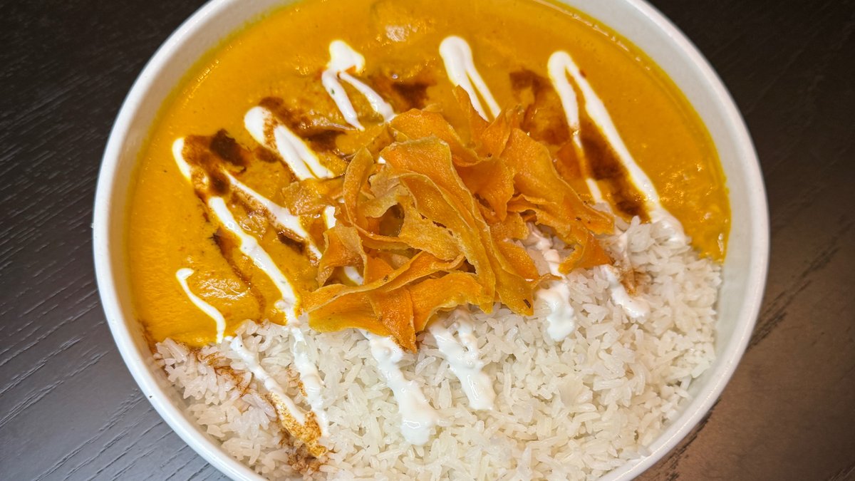 (140/200g) kuracie prsia (SK), mango coconut curry omáčka, basmati ryža, limetkový jogurt, cashew, batátový chips, chilli olej, Alergény: 6, 7, 8, 12