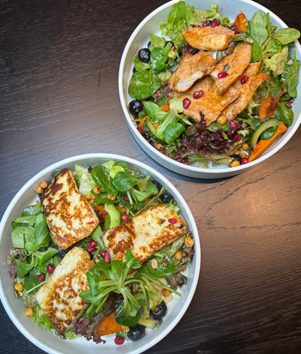 (420g) miešaný listový šalát, pečené bataty, kuracie mäsko (SK) /medové halloumi, uhorka, čučoriedky, cícerový crunch, tekvicové jadierka, dressing z granátového jablka, Alergény: 7, 8, 9, 10, 12