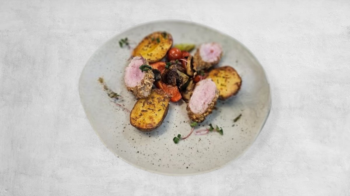 Bravčová panenka s v bylinkovej kruste,grilovaná zelenina,pečené zemiaky
