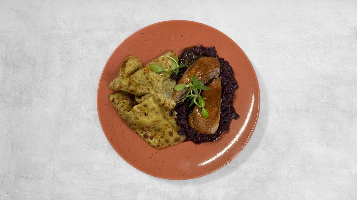 Konfitované kačacie prsia,červená kapusta,2 ks lokša