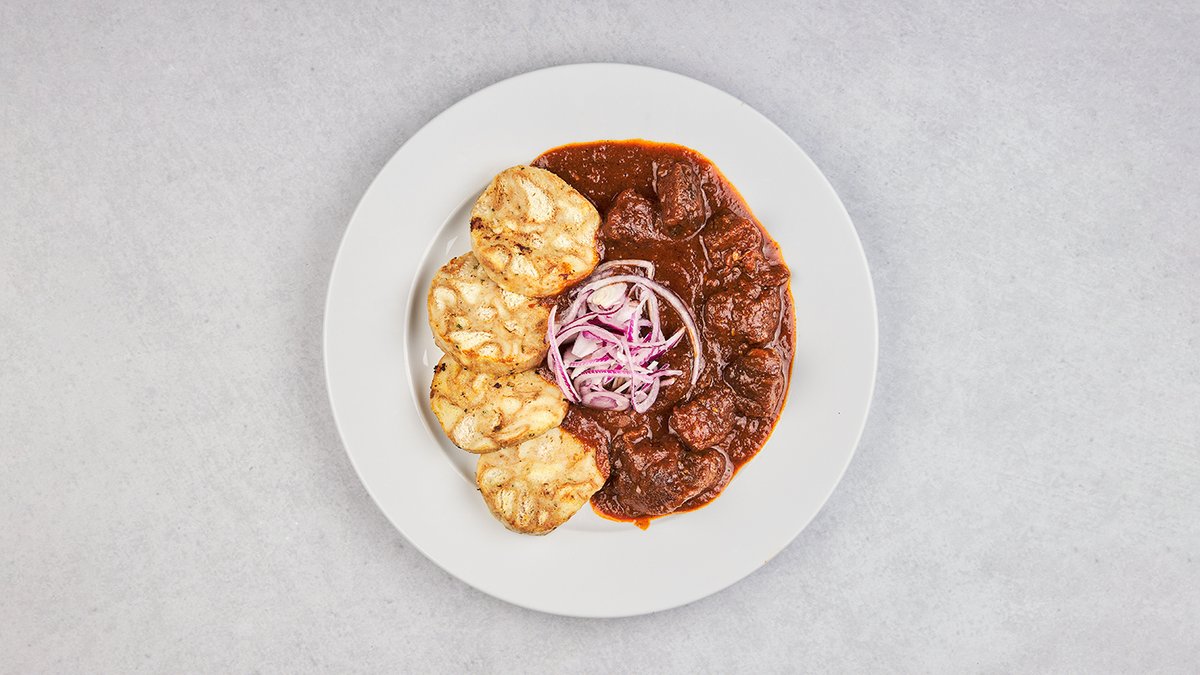 Hovädzí guláš s cibulkou a karlovarskou knedlou