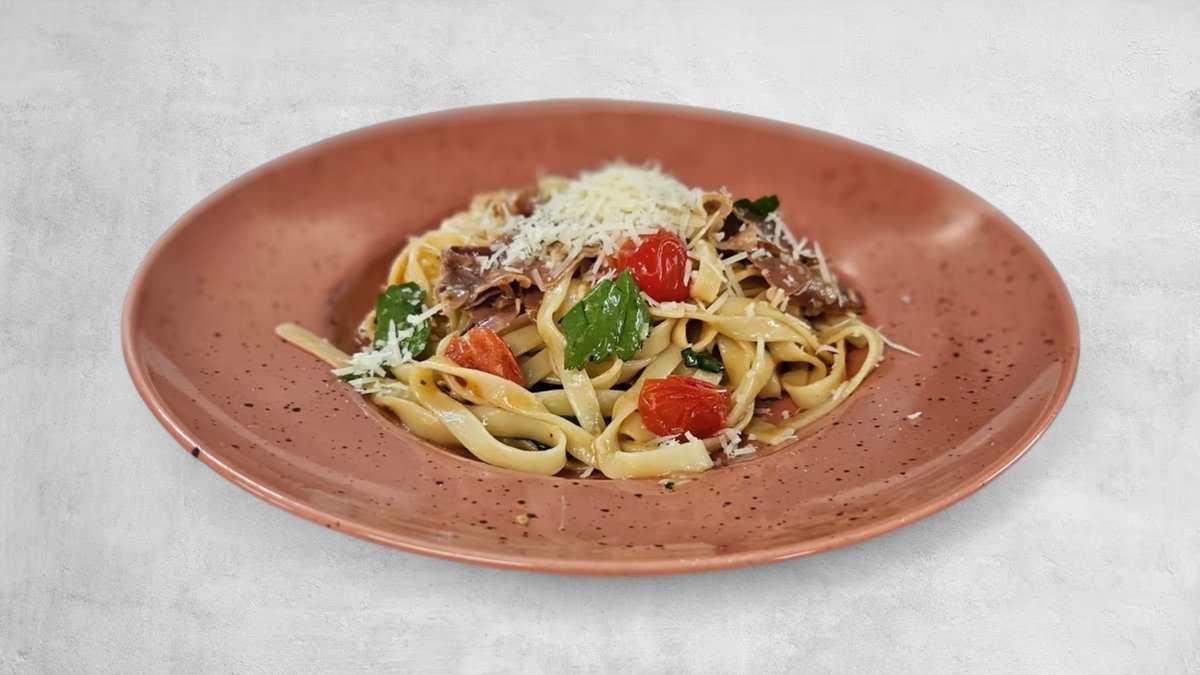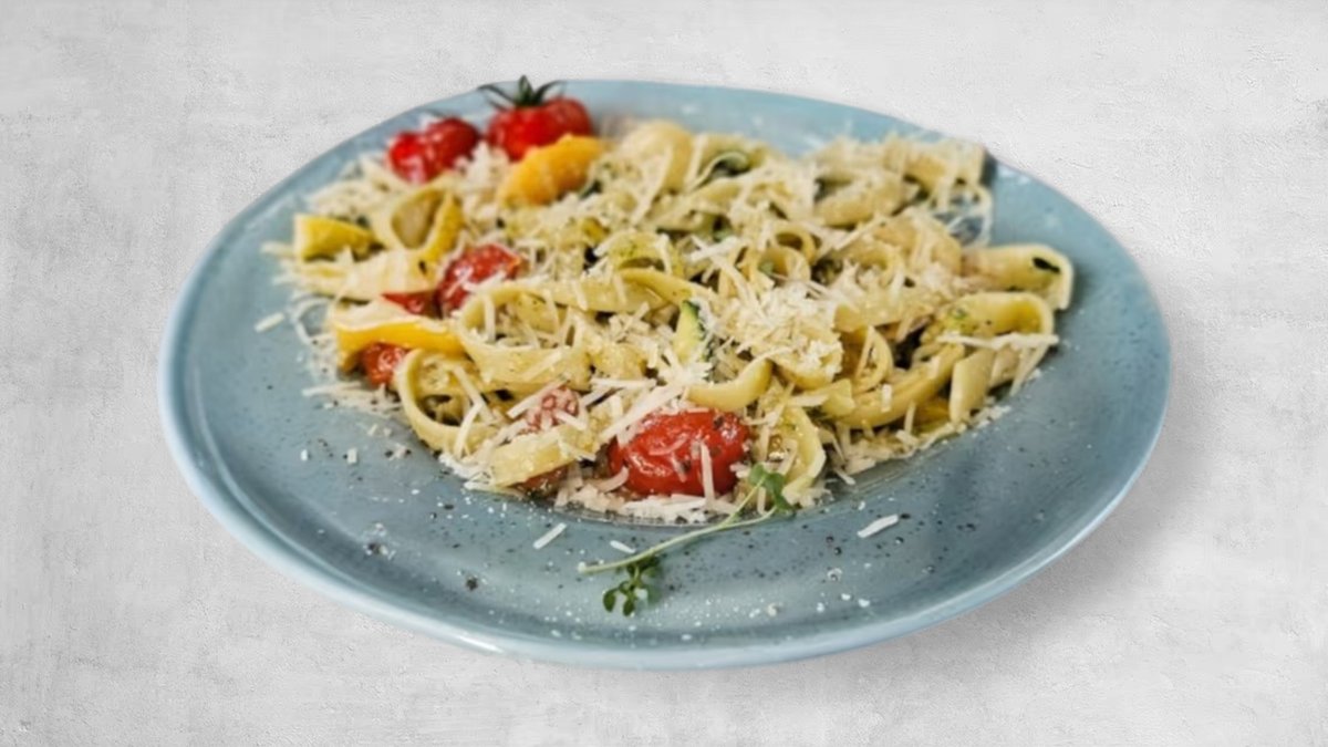 Tagliatelle s kuracím mäsom a parmezánom/paprika,cherry,cesnak,pesto/