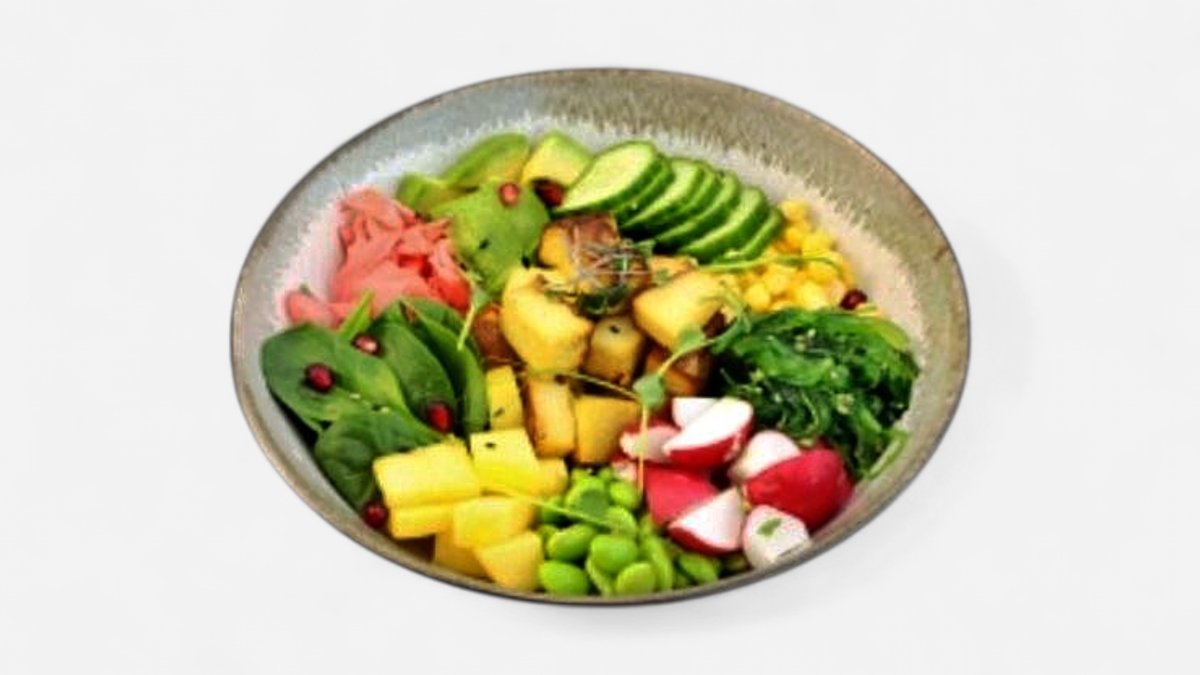 Sushi ryža, goma wakame riasa, tofu, mango, uhorka, kukurica, avokádo, zázvor, baby špenát, edamame, reďkovka, mikro bylinky, granátové jablko, sezam, teriyaki omáčka, japonská majonéza A: 3, 6, 11
