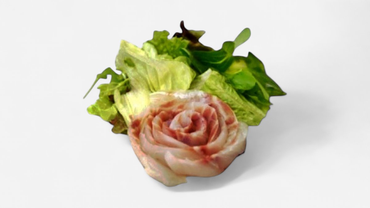 Listový šalát, flamovaný losos, avokádo, uhorka, goma wakame riasa, sezam , edamame, reďkovka, kapary, balsamikovo – olivová omáčka A: 4, 6, 11