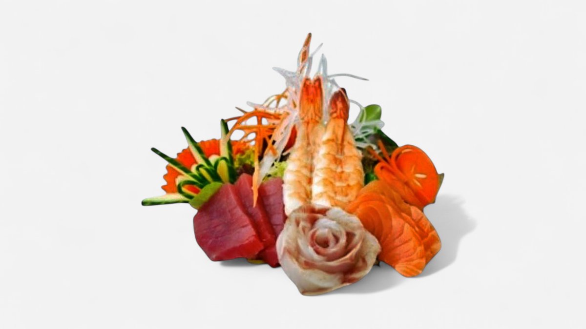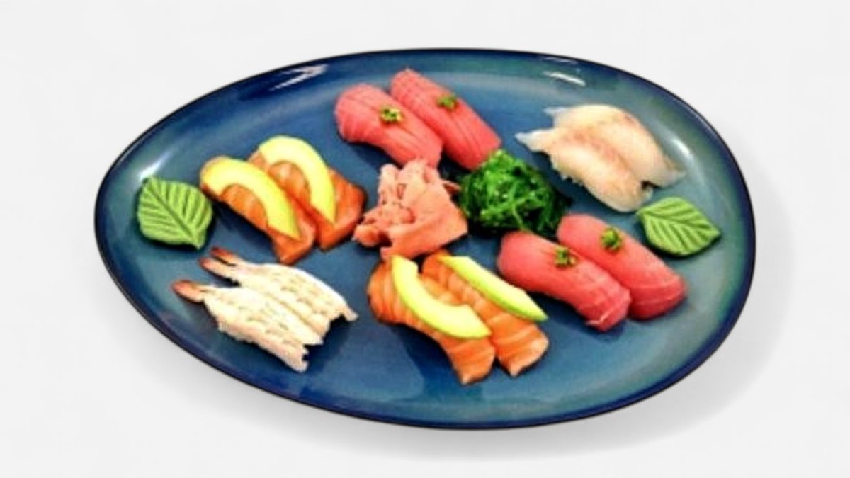 Losos, kreveta, tuniak, morský vlk, listový šalát, wasabi, nakladaný zázvor, sójová omáčka, surimi, uhorka, goma wakame riasa, sezam A: 2, 4, 12, sójová omáčka 1/6