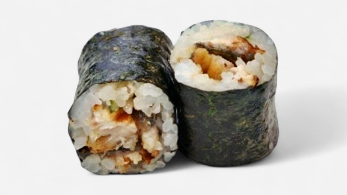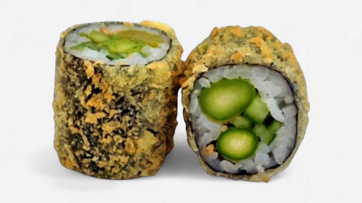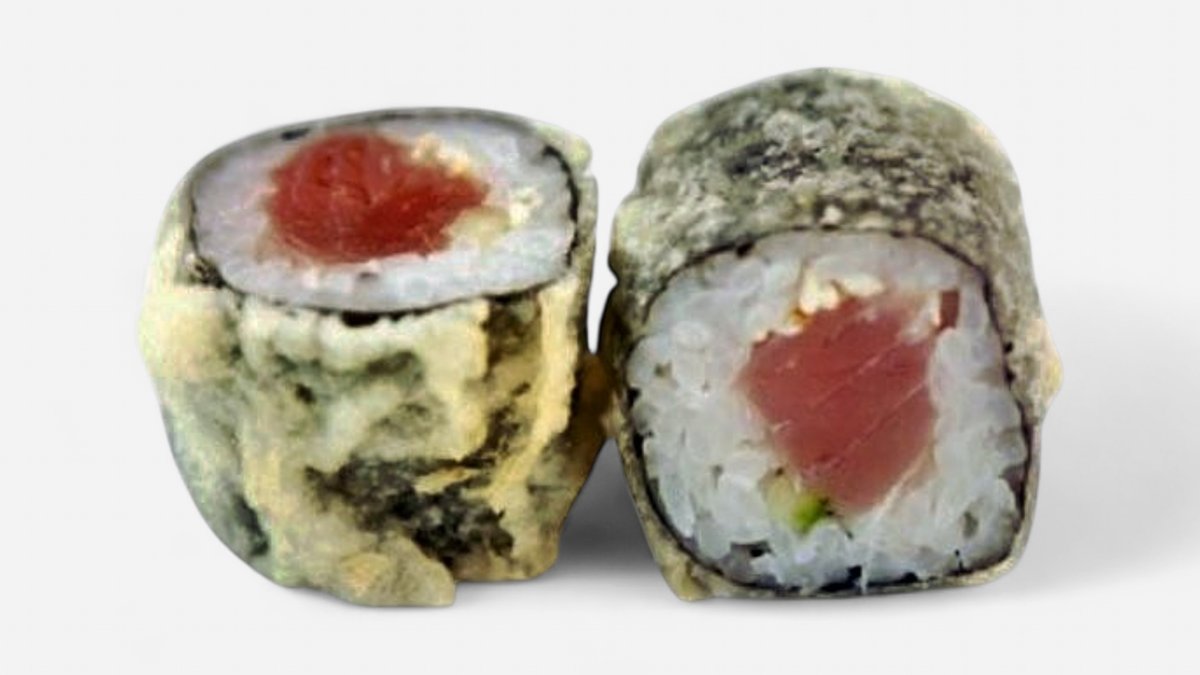 Tempura losos, krémový syr, chrumkavá panko strúhanka, uhorka, tempura múka, sushi ryža, morská riasa, wasabi, nakladaný zázvor, sójová omáčka, goma wakame riasa A: 1, 4, 7 sójová omáčka 1/6