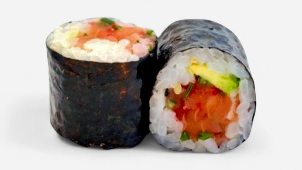 Losos, jarná cibuľka, uhorka, tobiko, avokádo, japonská majonéza, sezamový olej, nakladaný zázvor, opečená bagetka, goma wakame riasa A:3, 4, 11