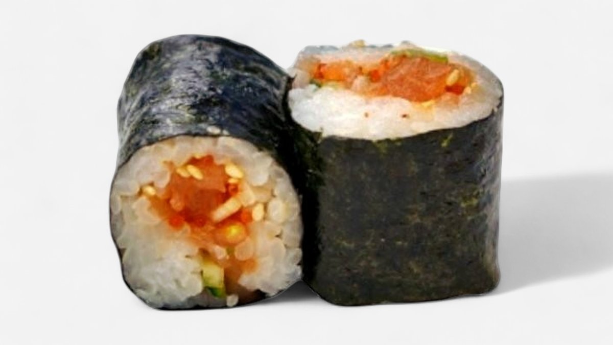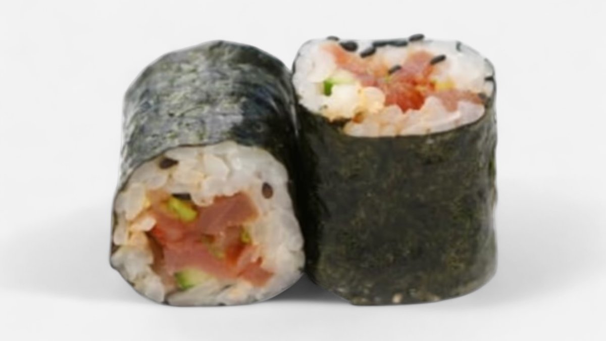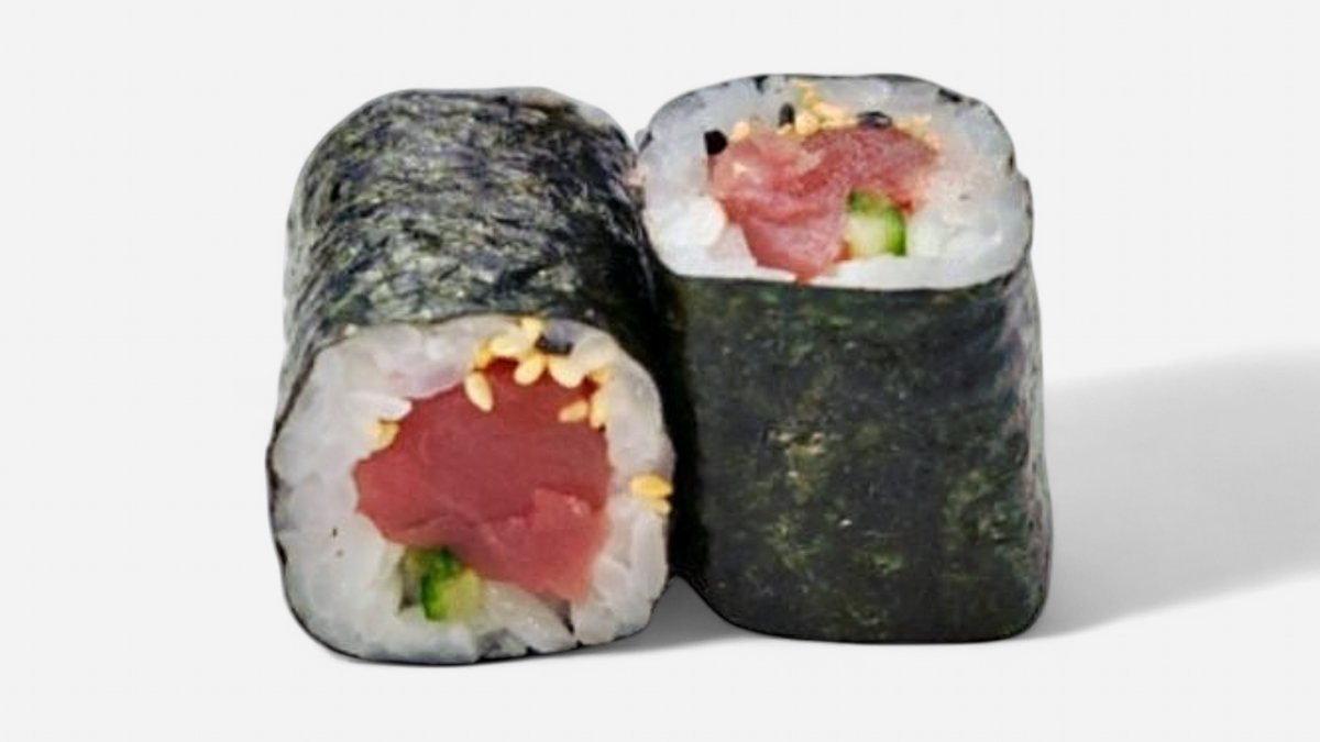 tuniak, jarná cibuľka, uhorka, tobiko, avokádo, japonská majonéza, sezamový olej, nakladaný zázvor, opečená bagetka, goma wakame riasa A: 3, 4, 11