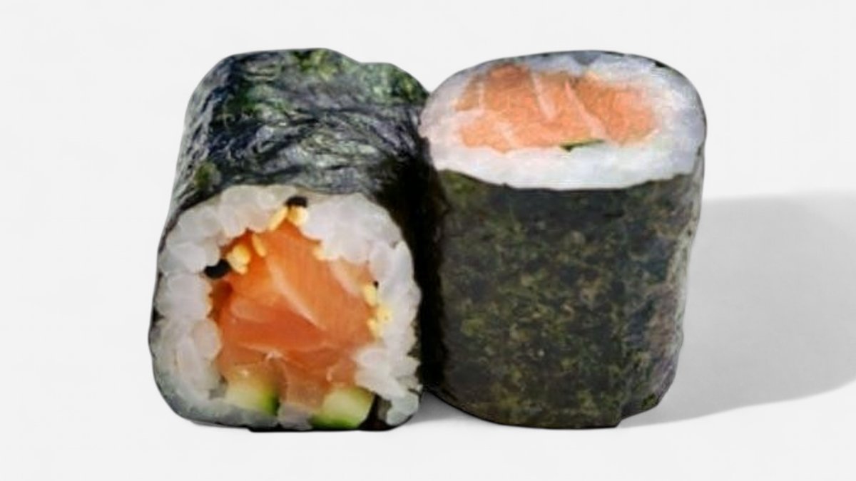 Losos, uhorka, sushi ryža, morská riasa, wasabi, nakladaný zázvor, sójová omáčka, sezam, goma wakame riasa A: 4, 11, 12, sójová omáčka 1/6
