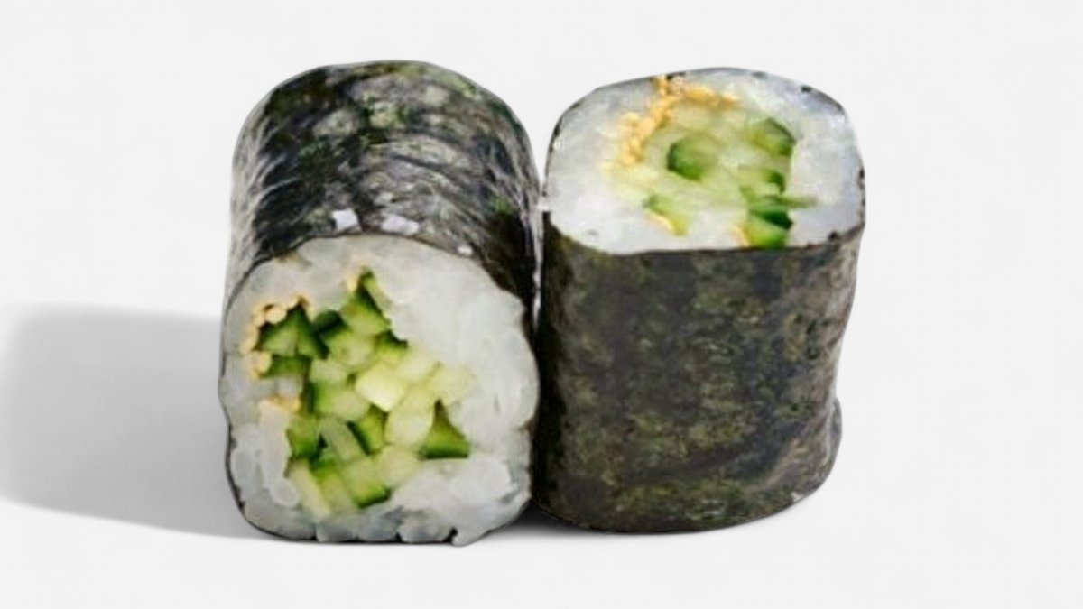 Uhorka, sushi ryža, morská riasa, wasabi, nakladaný zázvor, sójová omáčka, sezam, goma wakame riasa A: 11, 12, sójová omáčka 1/6