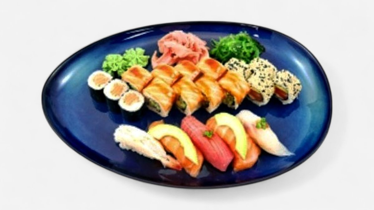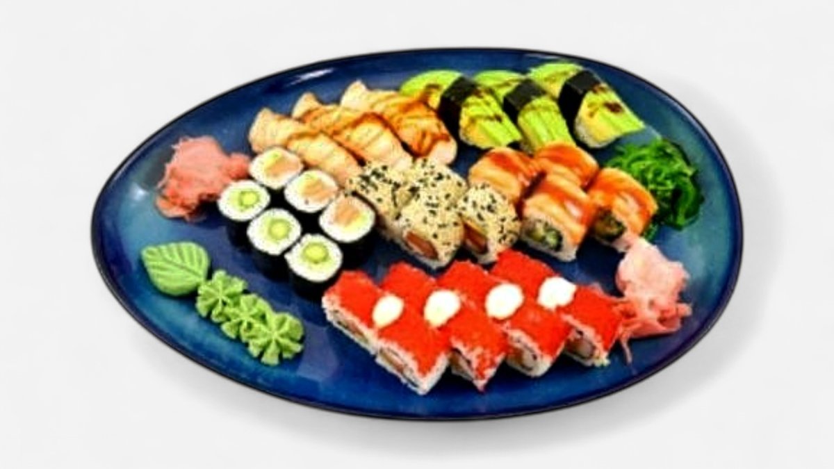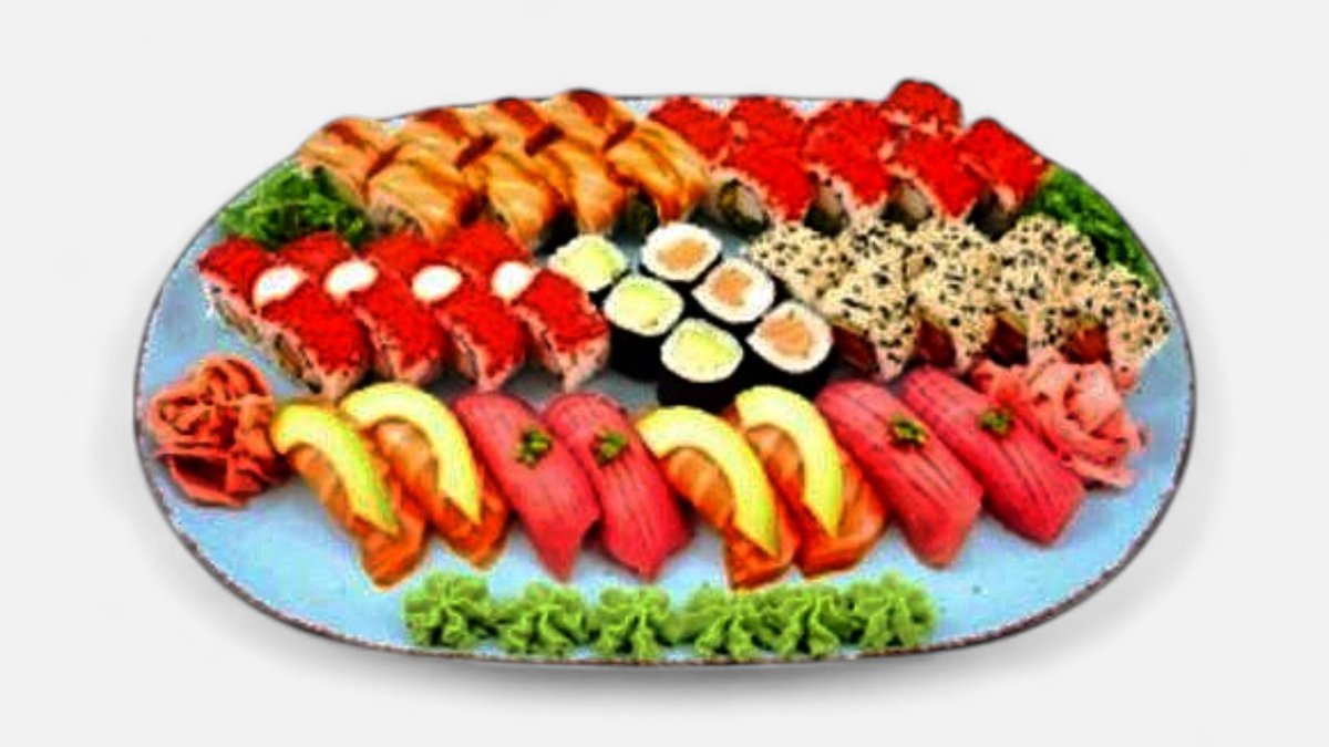 8ks california roll, 8ks philadelphia roll, 8ks boston roll, 3ks avokado maki, 3ks losos maki, 8ks sezam roll, 4ks tuniak nigiri, 4ks losos nigiri, nakladaný zázvor, wasabi, sójová omáčka, goma wakame riasa A: 2, 3, 4, 6, 7, 11, 12, sójová omáčka 1/6 Porcia predpoklad: 3-4 osoby