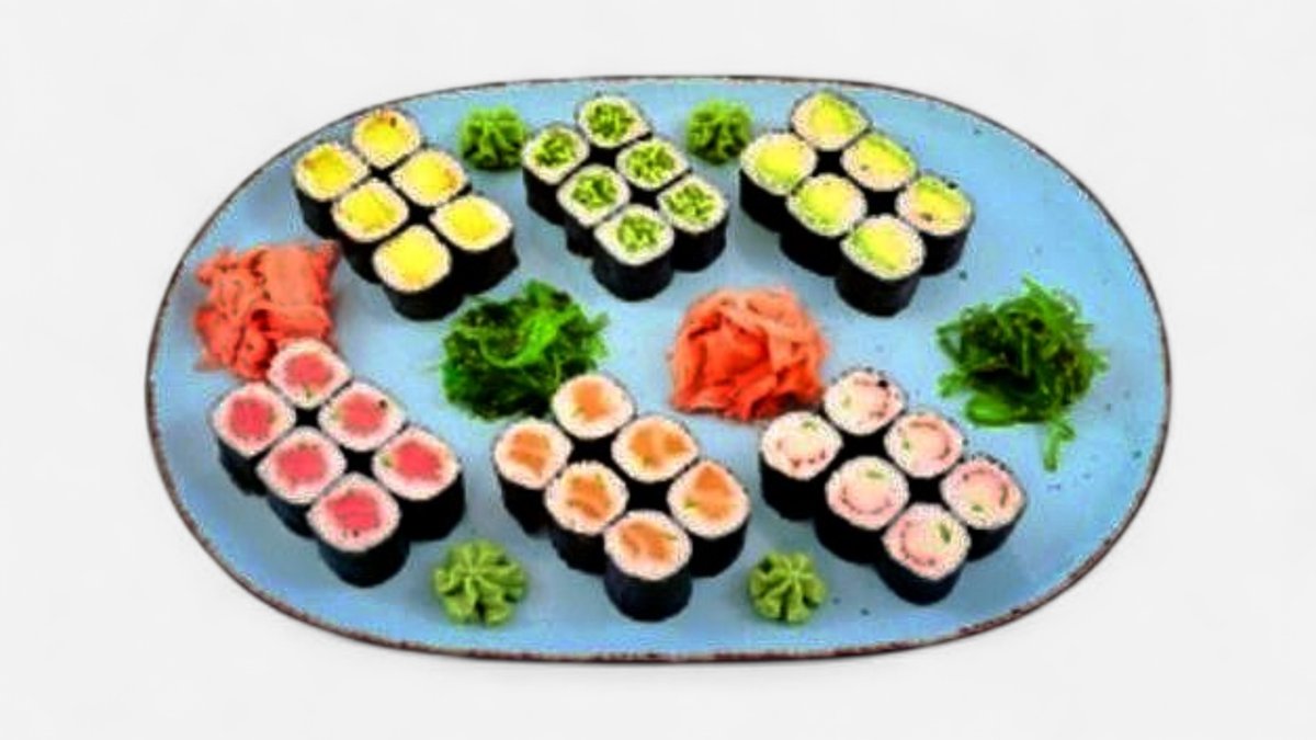 6 ks mango maki, 6 ks surimi maki , 6 ks losos maki, 6 ks uhorka maki, 6 ks tuniak maki, 6 ks avokádo maki, nakládaný zázvor, wasabi, sójová omáčka, goma wakame riasa A: 4, 11, 12, sójová omáčka 1/6 Porcia predpoklad: 2 osoby