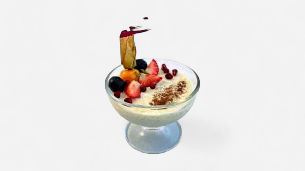 Ryža, kokosové mlieko, škorica, cukor, mlieko, karamelový toping A: 7