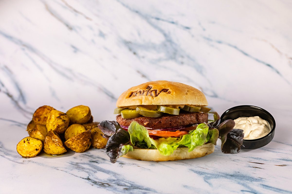 Klasika s paradajkami, červenou cibuľou, kyslou uhorkou, šalátom a našou domácou omáčkou v chrumkavej žemli s ľahko korenenými Grenaille zemiakmi a dip podľa výberu, ktorý si zvolíte v možnostiach nižšie 350g+170g / obsahuje: 1,6,9,10