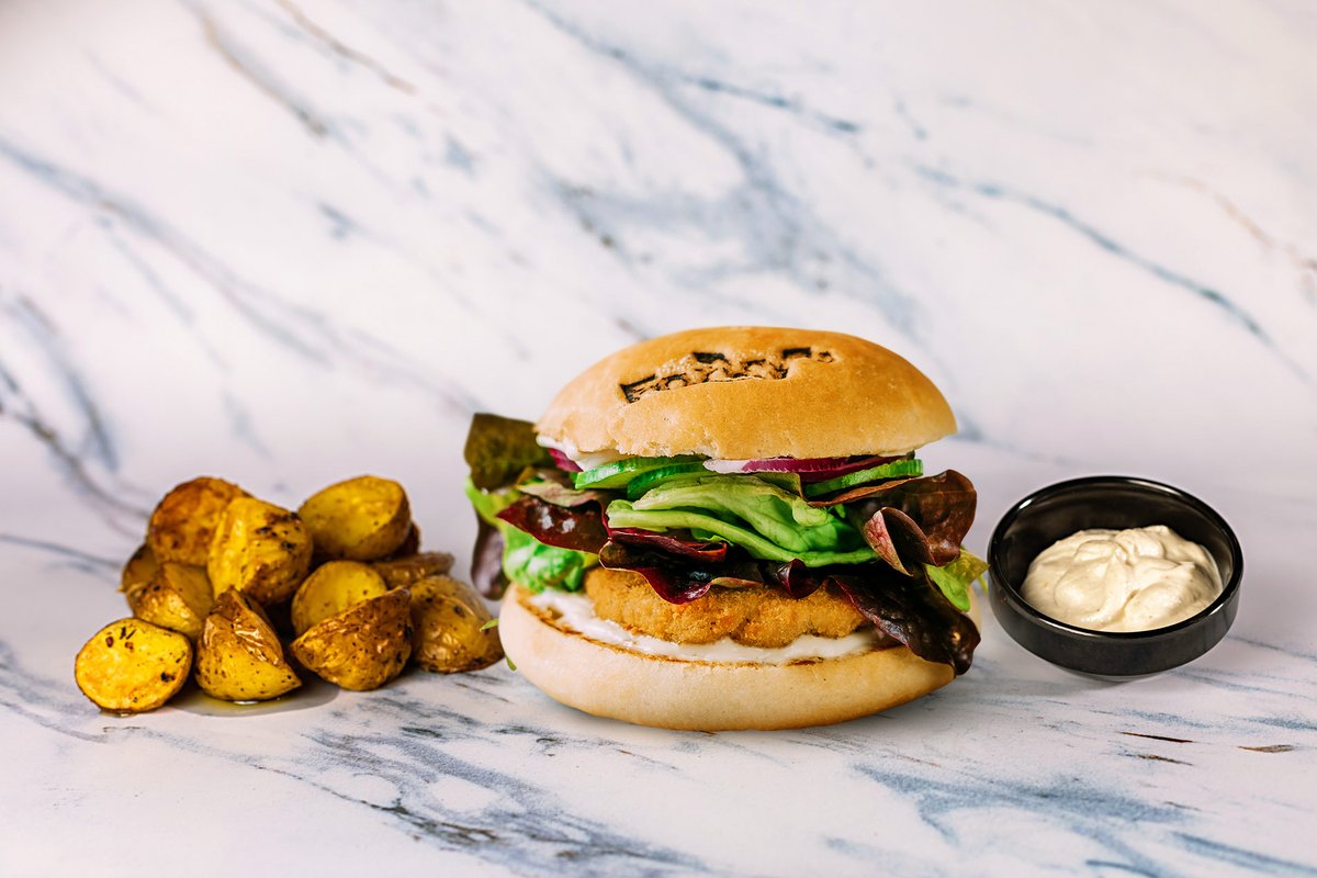 smažený rezeň s „kuracou“ príchuťou, chrumkavým šalátom, uhorkou, červenou cibuľkou a fresh mayo s ľahko korenenými Grenaille zemiakmi a dip podľa výberu, ktorý si zvolíte v možnostiach nižšie 270g+170g / obsahuje: 1,6,10