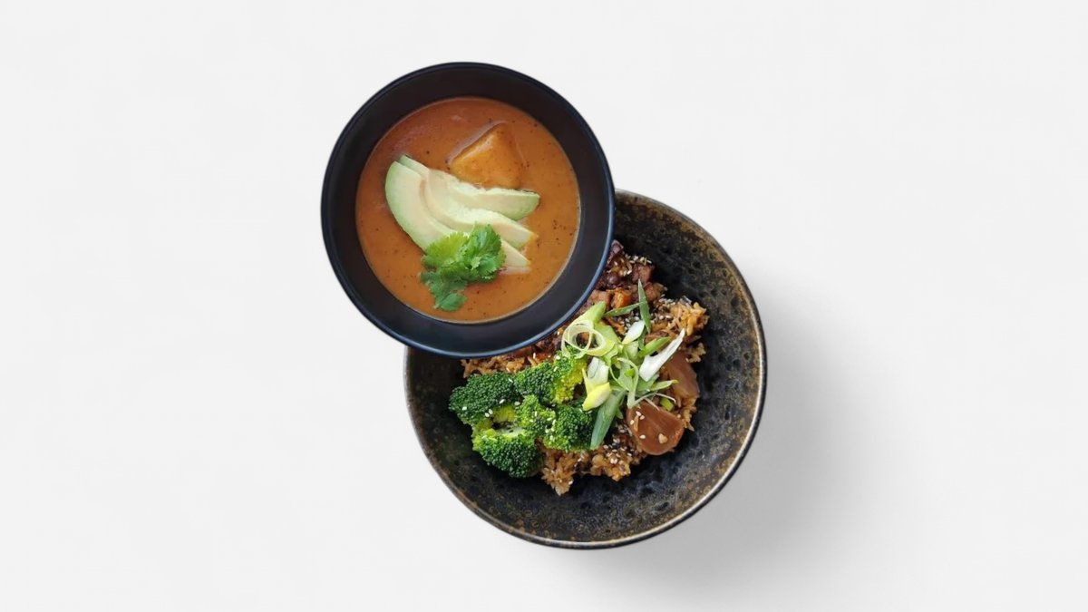 Ekvádorská s avokádom: 250ml (Hustá zemiaková polievka so smotanou, avokádom, kukuricou a koriandrom) Korean barbecue bowl s tofu: 350g (1,6,11) (Restovaná zelenina s ananásom, tofu, červená kapusta, jarná cibuľka a domáca BBQ omáčka) Nápoj: 350ml