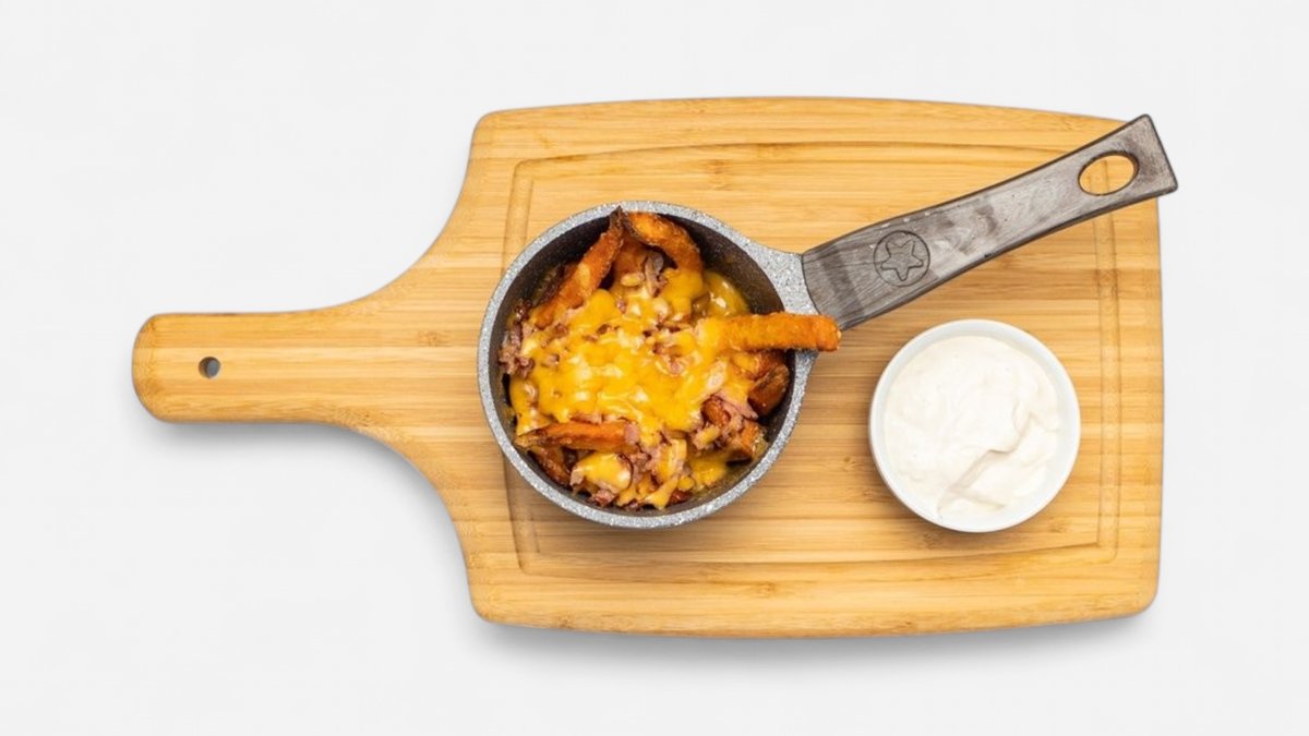 Batátové hranolky so slaninkou, cheddarom a cesnakový dresingom
