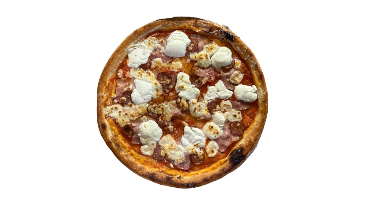 paradajkový základ, syr Mozzarella, šunka, pikantná saláma, feferóny, olivy 1,06kg