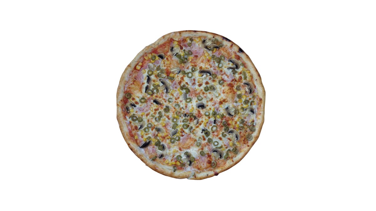 paradajkový základ, syr Mozzarella, šunka, kukurica, olivy, šampiňóny 0,97kg