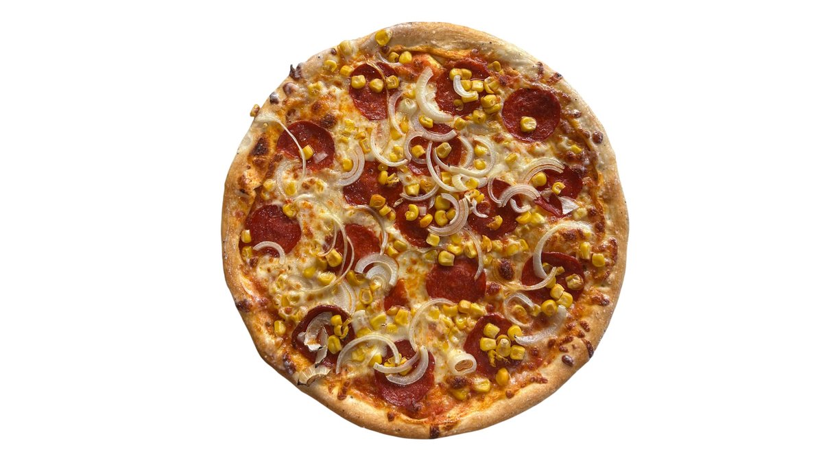 paradajkový základ, syr Mozzarella, pikantná saláma, cibuľa, kukurica 0,49kg