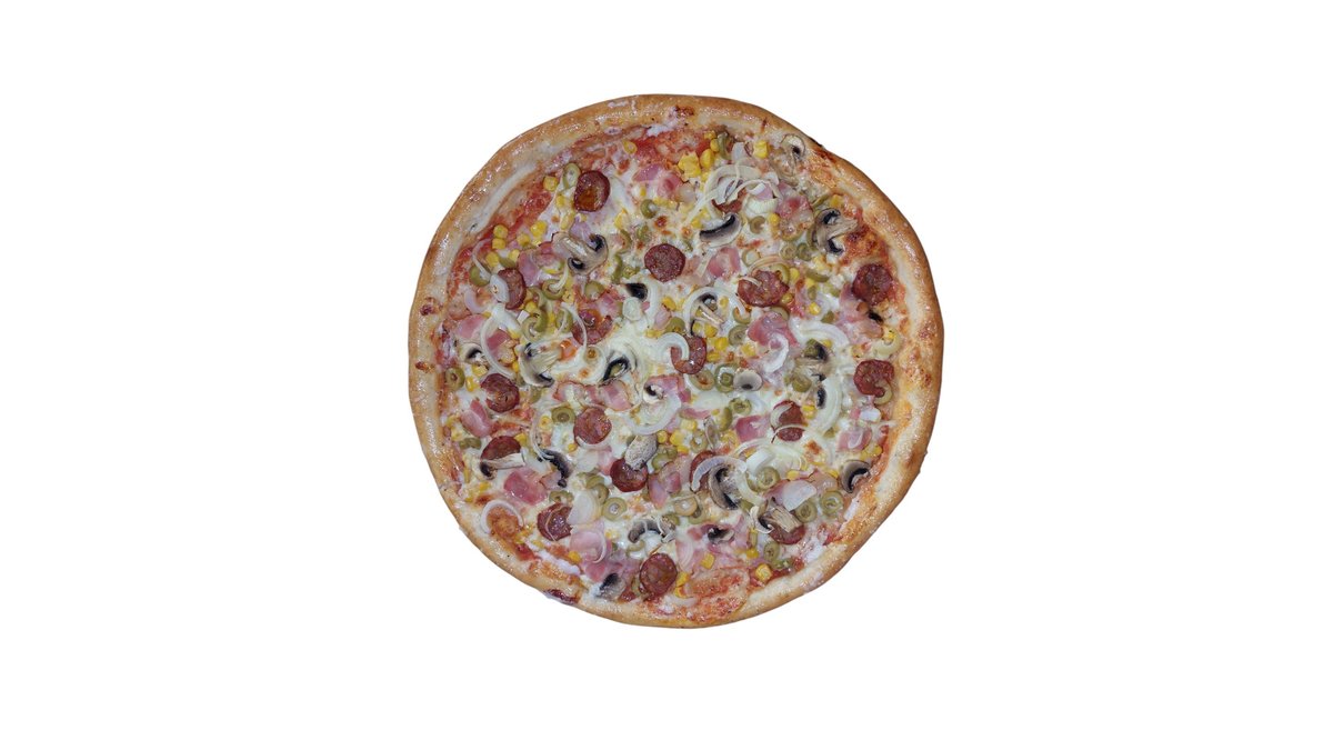 paradajkový základ, syr Mozzarella, slanina, klobása, šunka, šampiňóny, cibuľa, kukurica, olivy 1,2kg
