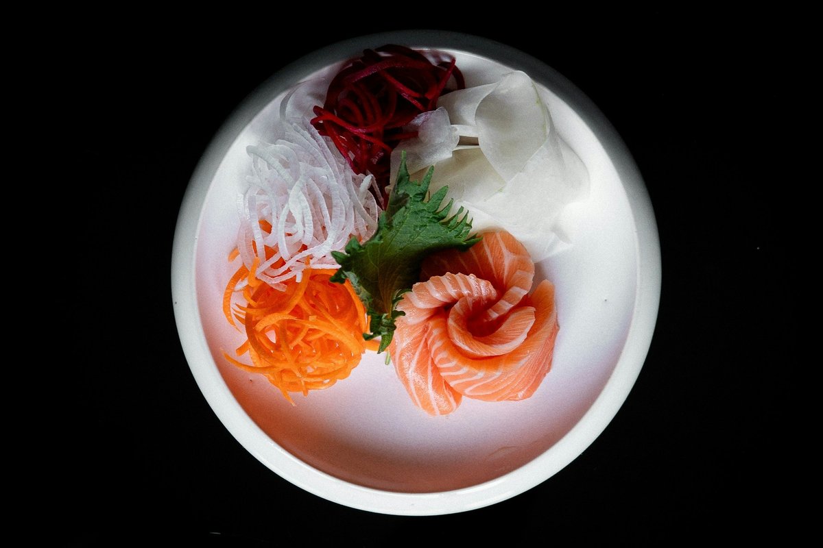 IN: losos, avokádo, uhorka mayo, pažítka OUT: lososové tataki, tobiko mayo, bylinky 3,4,6