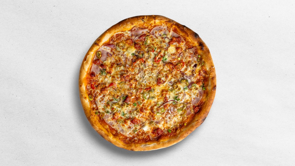 (tomato, eidam, mozzarella, šunka, jalapeños, cibuľa, kuracie mäso)