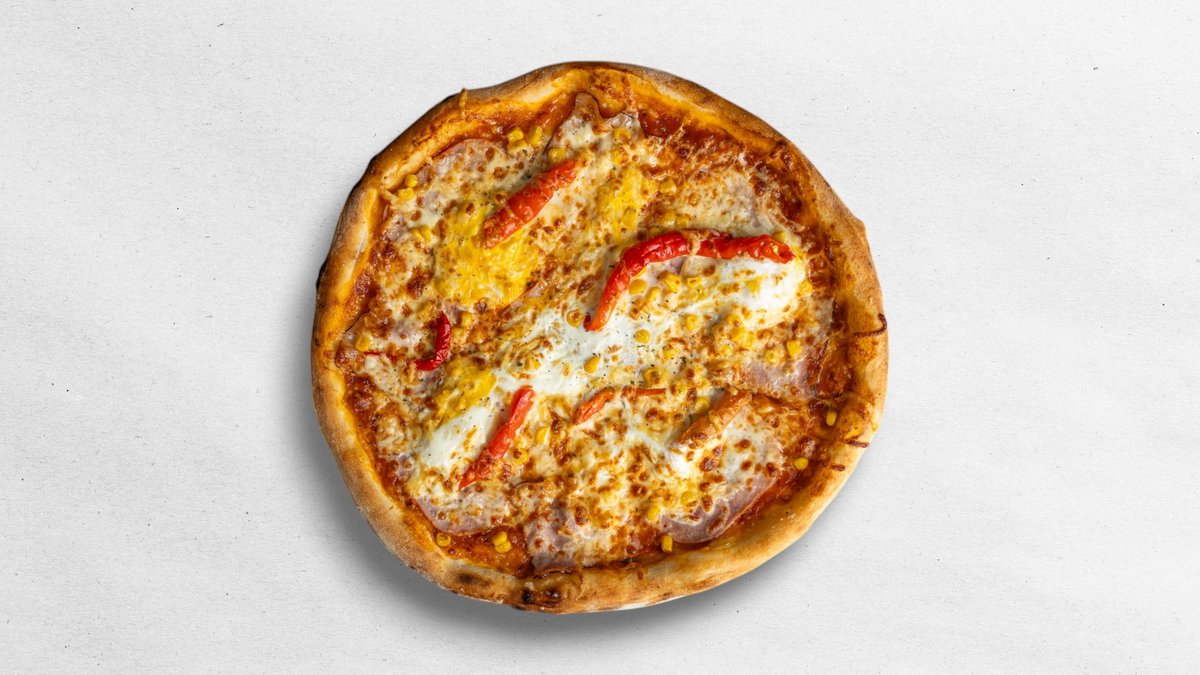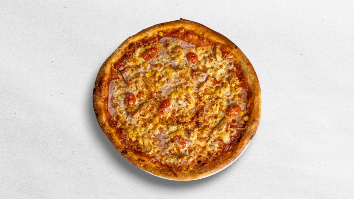 (tomato, eidam, mozzarella, šunka, údený syr, kukurica, kuracie mäso)