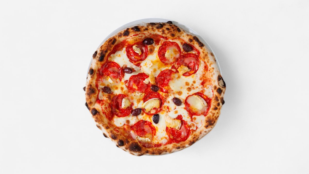 Paradajkový základ, mozzarella fior di latte, chorizo, kozí syr, čierne olivy 470g
