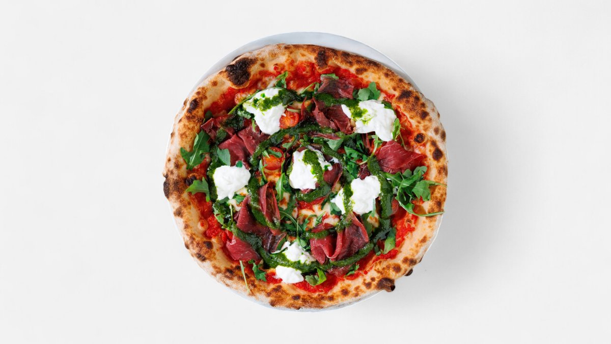 Paradajkový základ, mozzarella fior di latte, bresaola, stracciatella, bazalkové pesto, cherry paradajky, rukola 470g