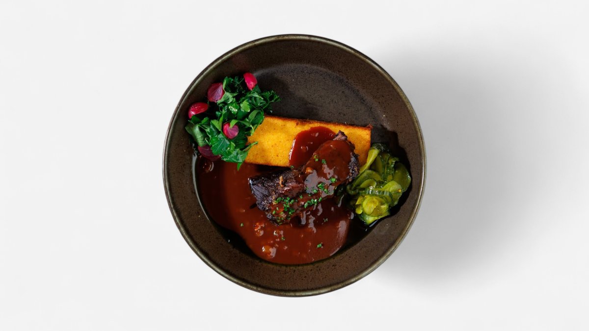 pomaly pečené hovädzie rebro s jemnou slivkovou BBQ omáčkou, podávané s nakladanými uhorkami, vyprážanou kukuričnou kroketou, šalátom z vňate, mätou a kôprom
