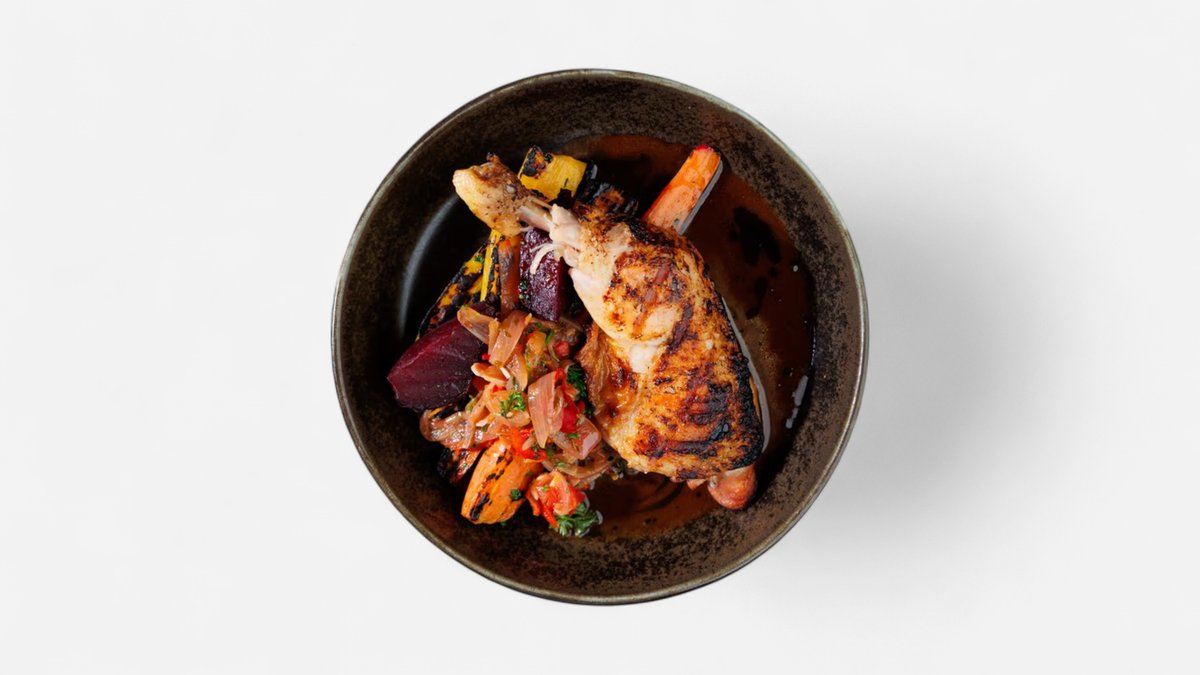 šťavnaté kuracie mäso v limetkovo-adobo omáčke s cesnakom, oreganom a údenou paprikou, podávané s opečenou koreňovou zeleninou, limetkovou aioli a salsou criolla