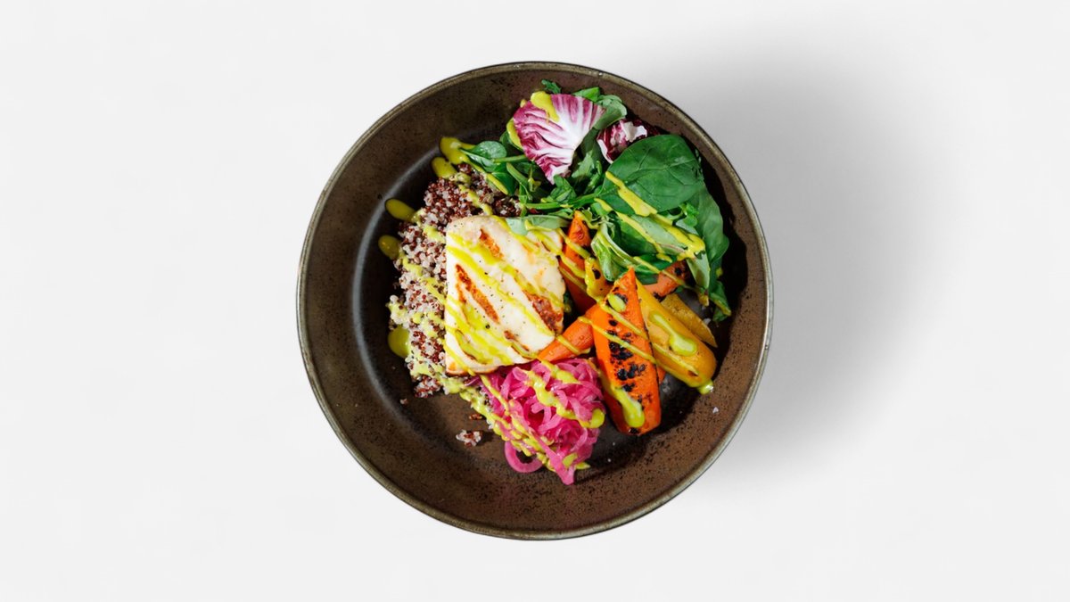 svieži šalát s quinoou, grilovaným halloumi, nakladanou cibuľou, bylinkovou majonézou, grilovanou mrkvou a koriandrom