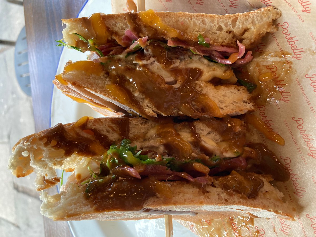Porchetta, rukola, nakladaná cibuľa, ementál, hoisin majo, mango chilli sauce, talianský sandwich