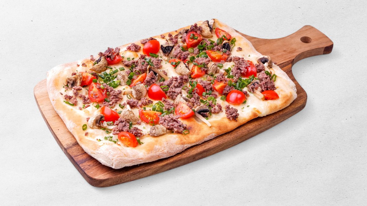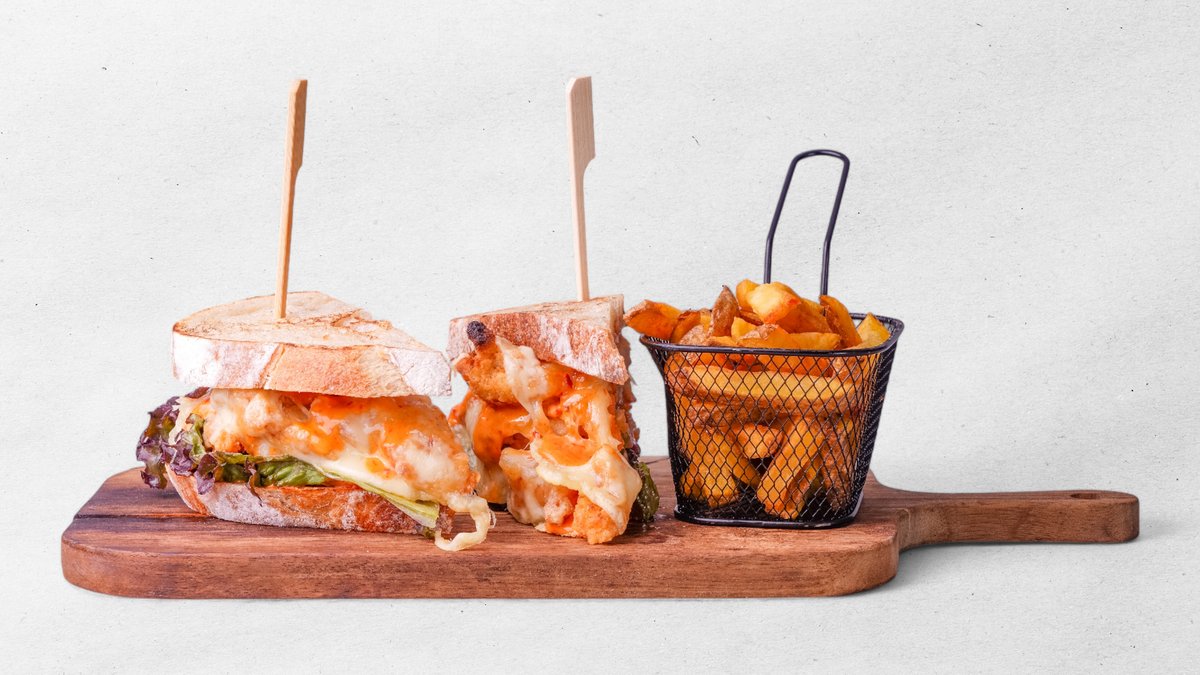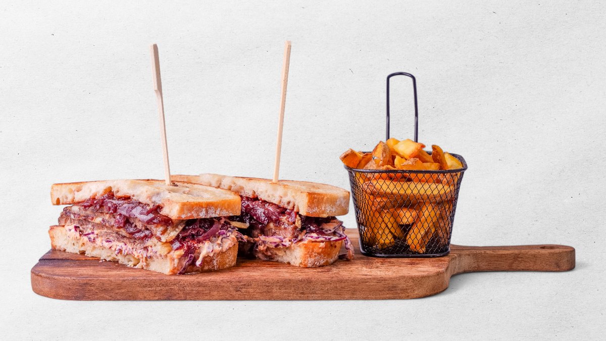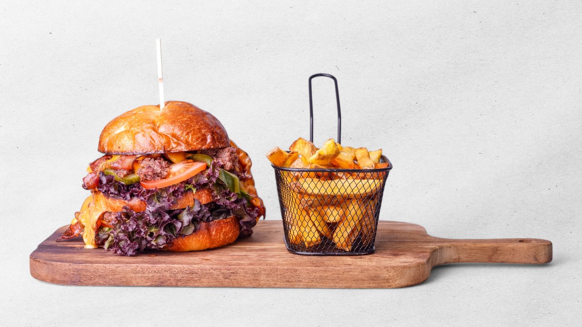 hovädzie mleté mäso, slanina, volské oko, nakladaná čerstvá uhorka, cheddar syr, paradajka, šalát, slaninová majonéza, kvásková žemľa, naše hranolky 150g / 350g / 1,3,7,10