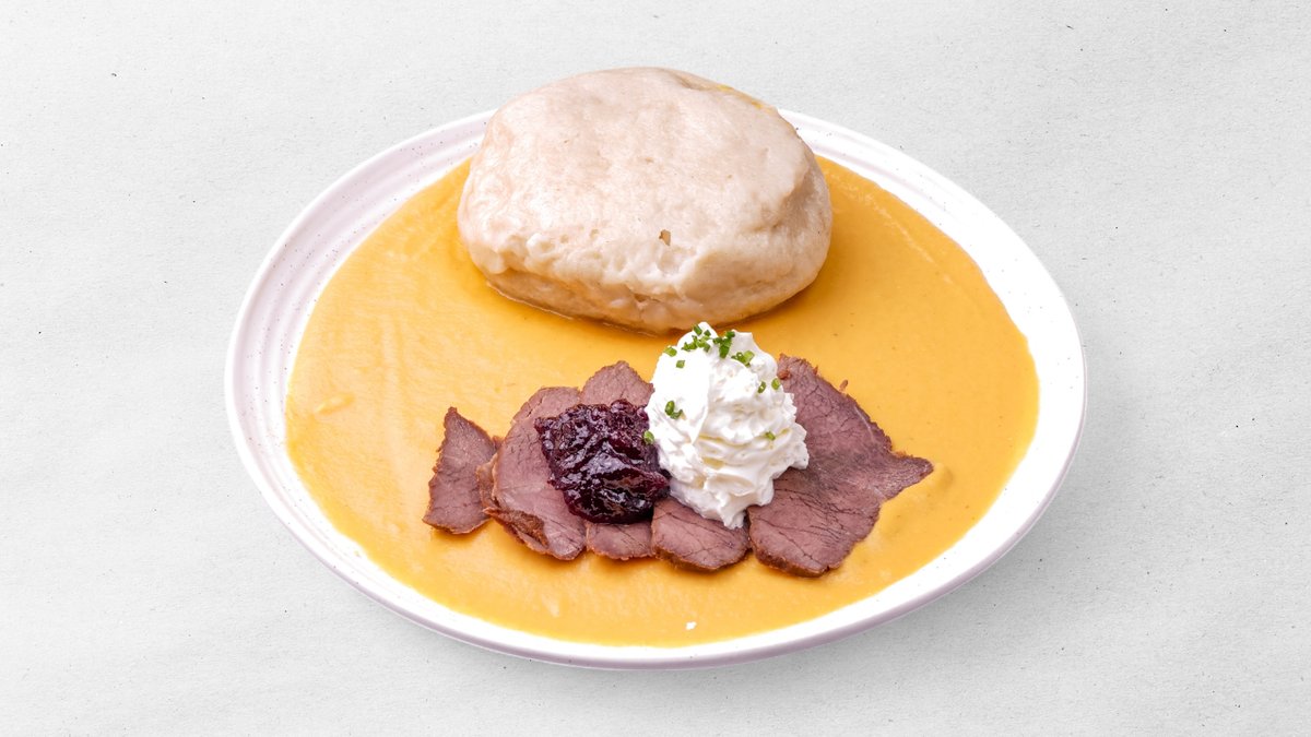 kysnutá knedľa, hovädzie sous vide, omáčka z koreňovej zeleniny, brusnicový džem, šľahačka 150g / 200g / 1,3,7,9