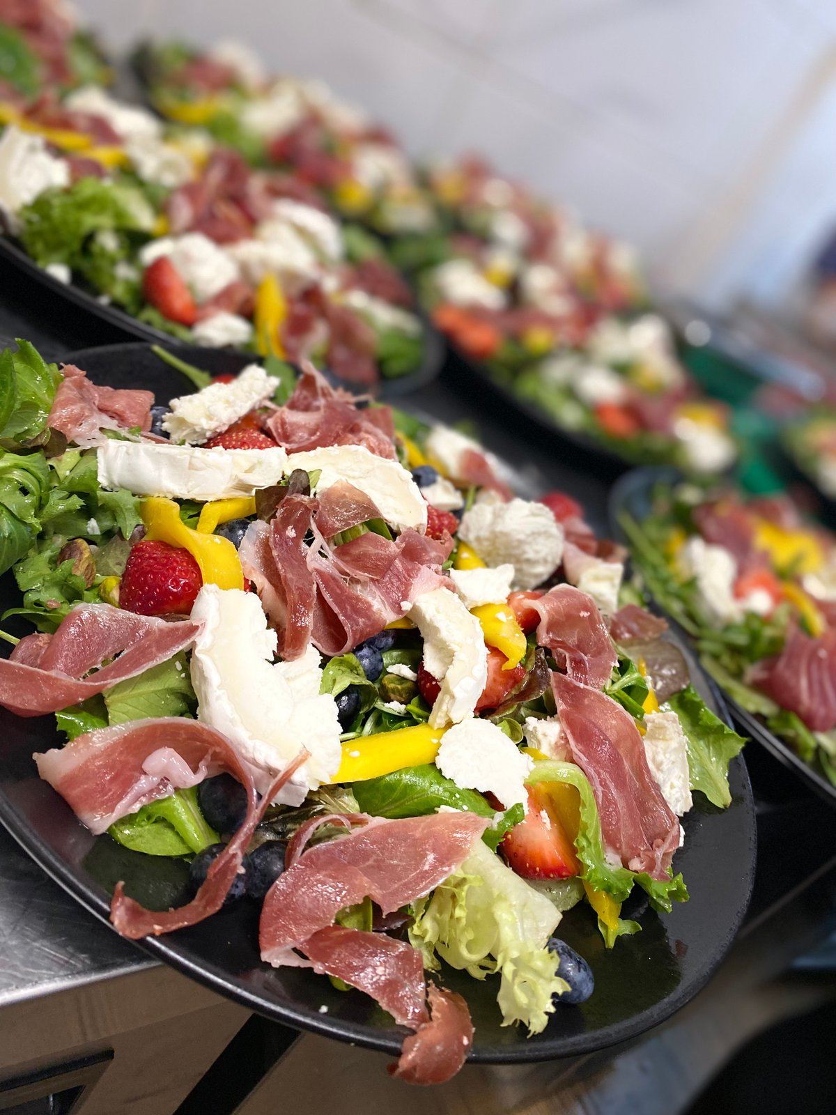 mix šalát, iberská šunka, kozí syr, medovo-pomarančový dresing, čerstvé ovocie, pražené pistácie