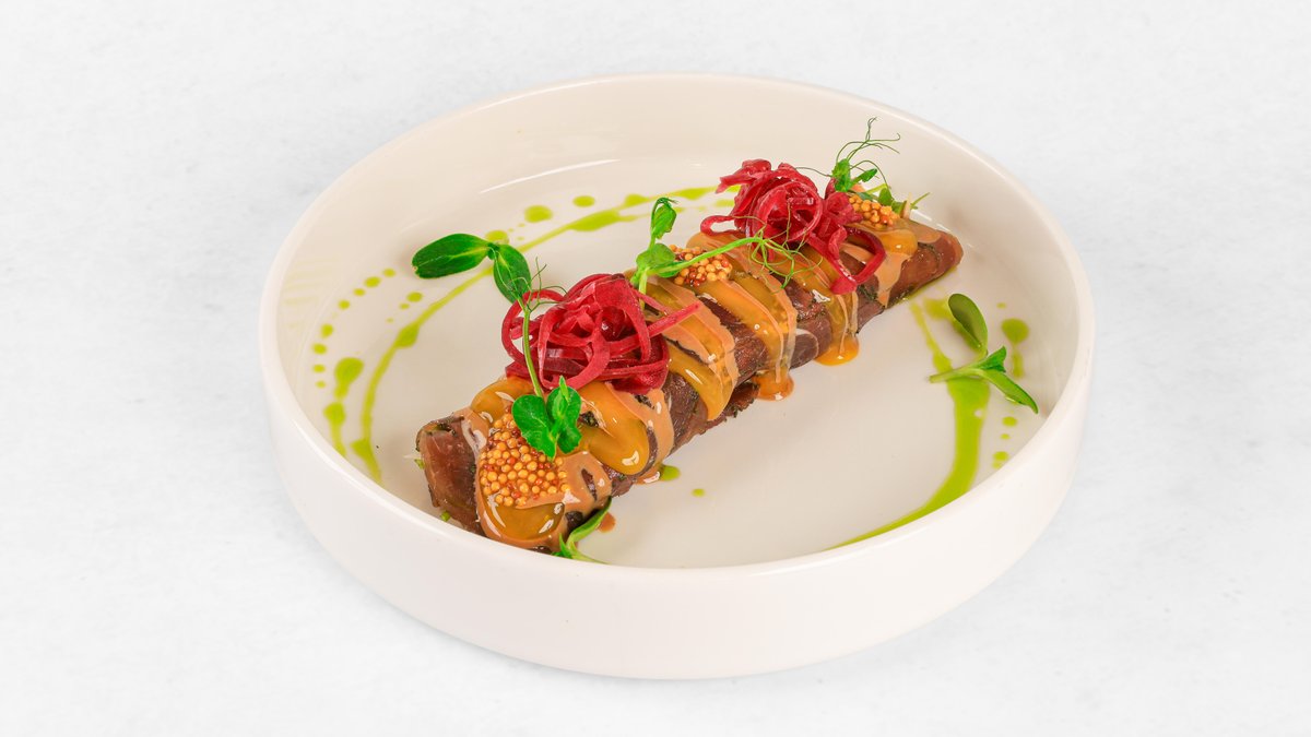 Z zelišči infuziran goveji hrbet, rukola, parmezan, konfitiran rumenjak, lističi parmezana, vložena čebula, emulzija iz gorčice in balzamičnega kisa V ceno jedi je všteto doplačilo 0.50 eur za biorazgradljivo embalažo