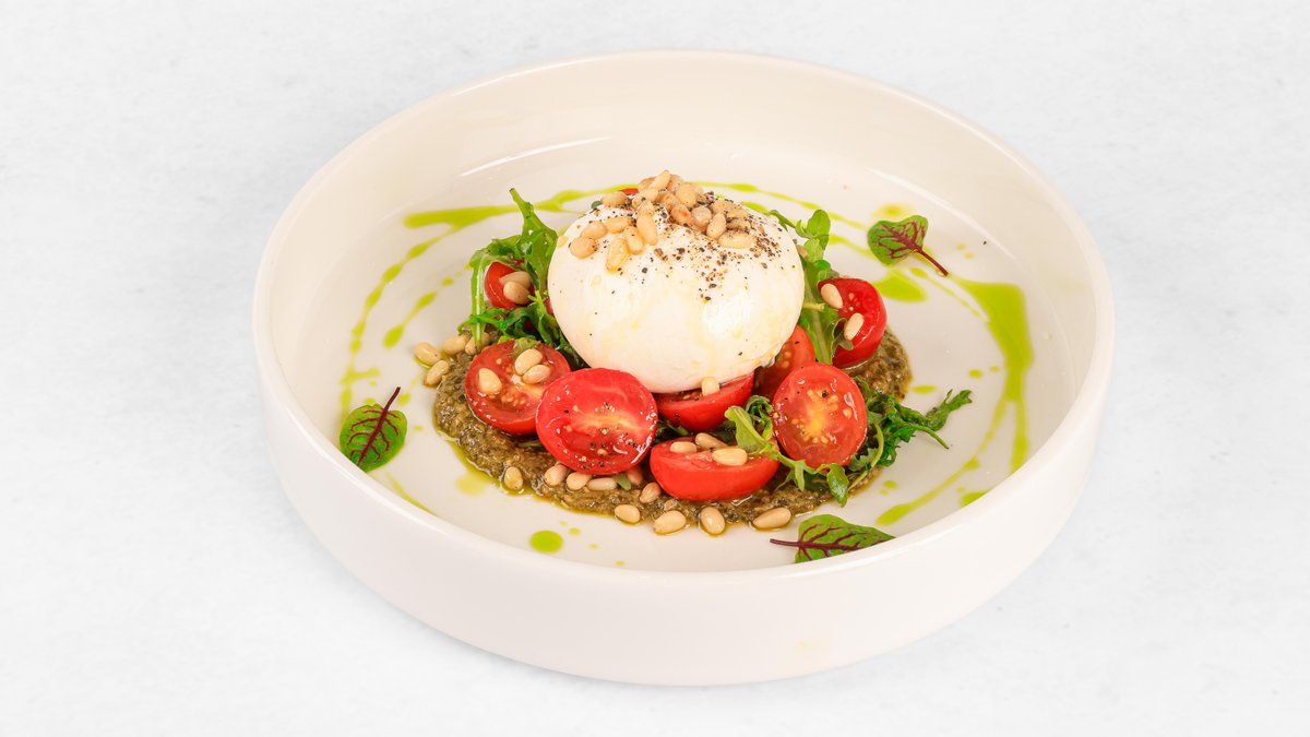 Burrata, pesto bazilike, tri vrste češnjevega paradižnika, rukola, pinjole, olivno olje V ceno jedi je všteto doplačilo 0.50 eur za biorazgradljivo embalažo