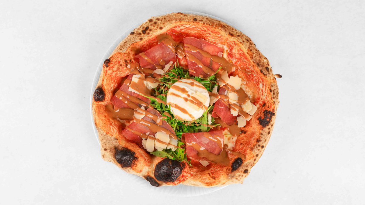 Pelati, mozzarella fior di latte, burrata, goveja bržola, rukola, emulzija gorčice in balzamičnega kisa V ceno jedi je všteto doplačilo 0.50 eur za biorazgradljivo embalažo